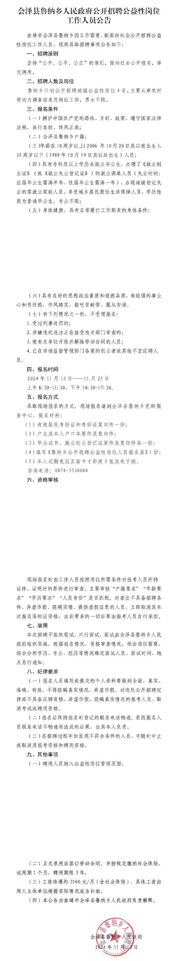 會(huì)澤縣魯納鄉(xiāng)人民政府公開招聘公益性崗位工作人員公告