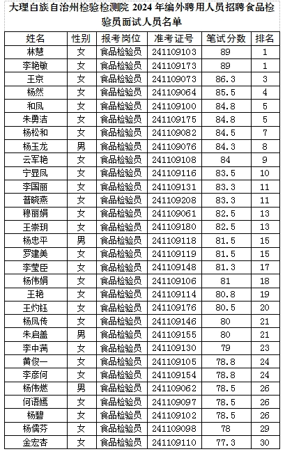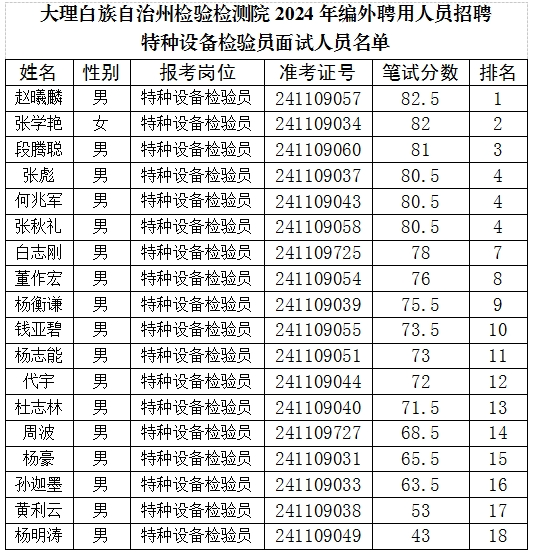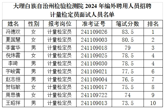 5.面試結束后,按照面試成績從高到低的順序與崗位招聘人數等額確定公示人員。公示人員作為擬聘用人員,在“大理檢驗檢測”微信公眾號公示5個工作日。