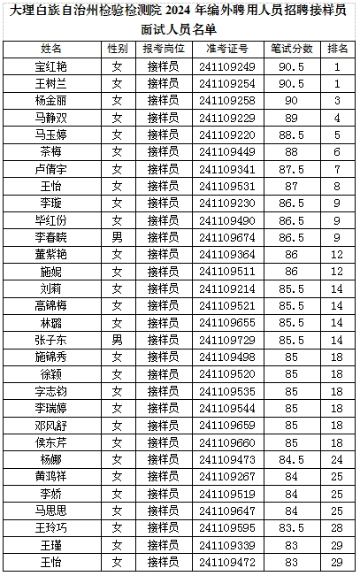 每個崗位按10:1的比例,以報考人員的筆試成績從高到低的順序確定面試人員名單,具體面試名單及成績詳見附件。