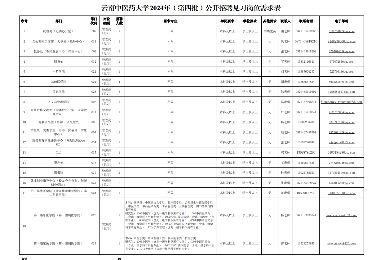 (一)崗位及條件:詳見附件《云南中醫(yī)藥大學(xué)2024年(第四批)公開招聘見習(xí)崗位工作人員計劃匯總表》。