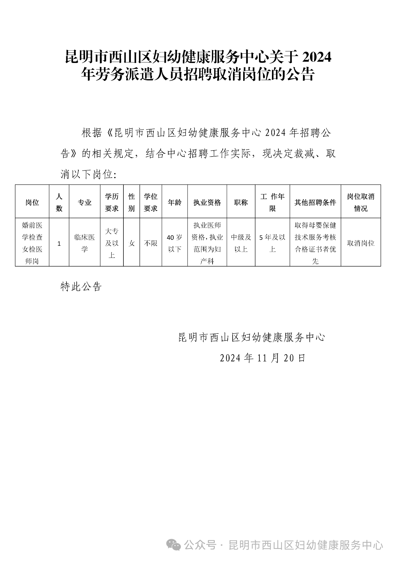昆明市西山區(qū)婦幼健康服務中心關于2024年勞務派遣人員招聘取消崗位的公告