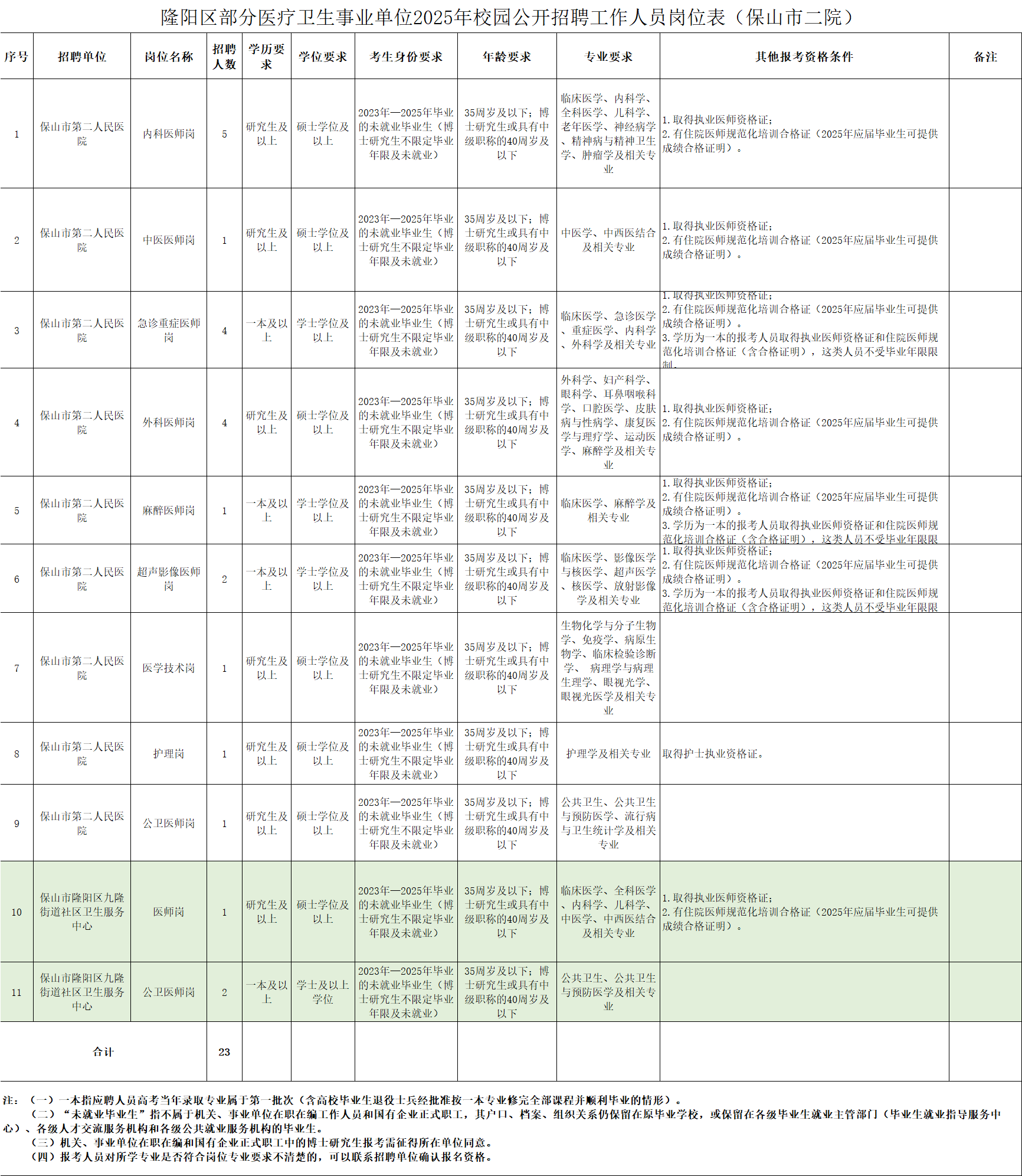 本次招聘編內(nèi)人員23人,其中,市二院(總院)20人、九隆分院3人。崗位具體要求詳見《隆陽區(qū)部分醫(yī)療衛(wèi)生事業(yè)單位2025年校園公開招聘工作人員崗位表(保山市二院)》。