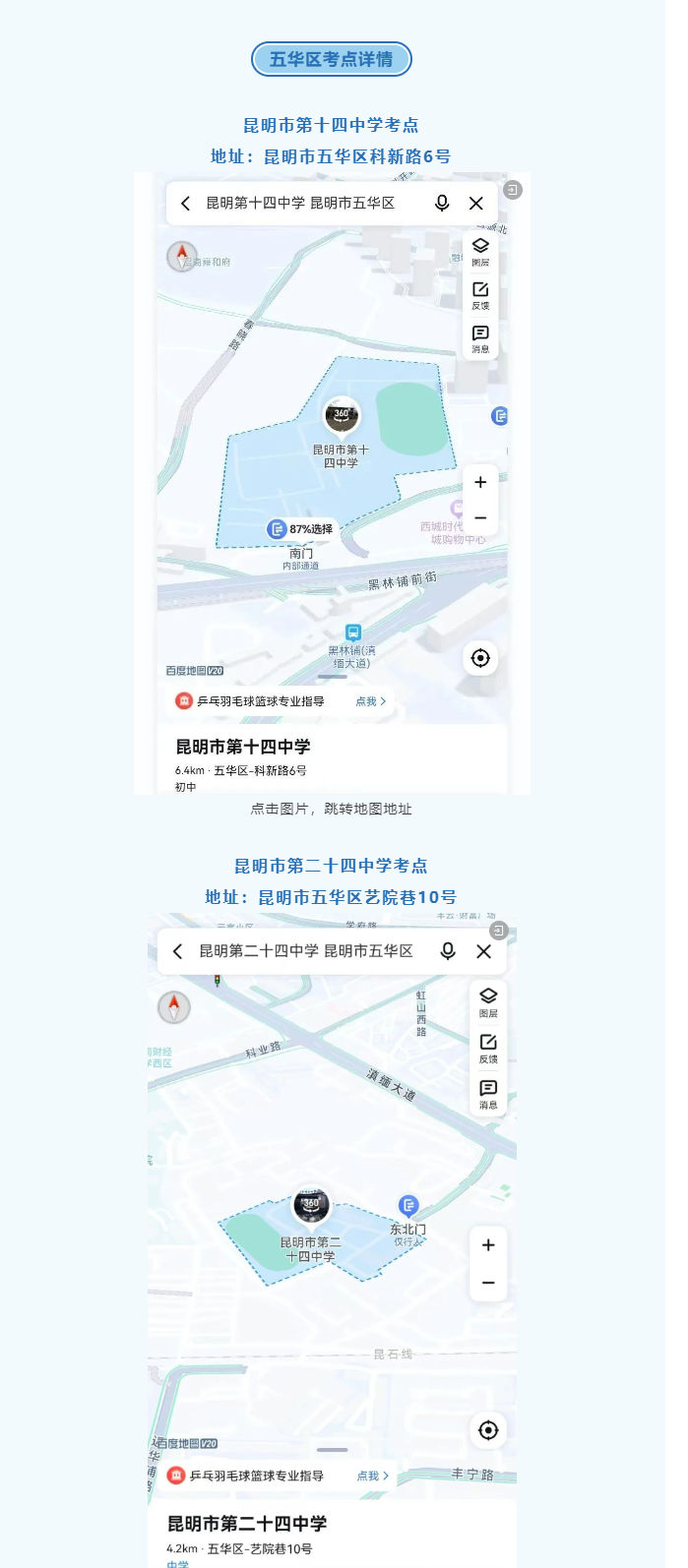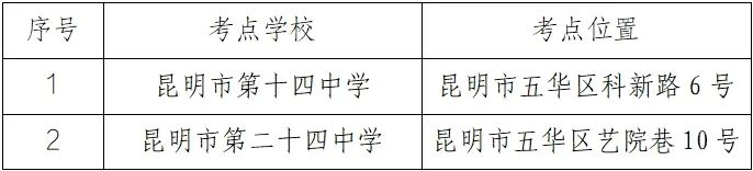 五華區(qū)共設2個考點。考生可根據(jù)準考證信息確認自己的考點,避免找錯考點、進錯考場??键c具體地址如下: