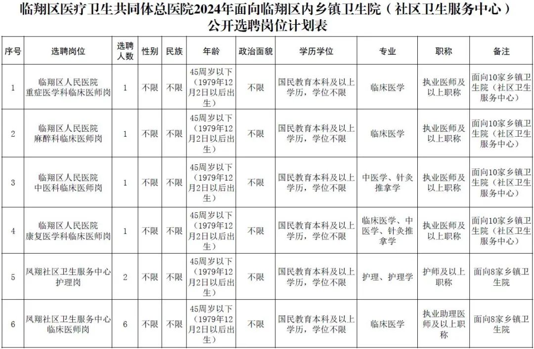 (十一)除上述基本條件外,各公開(kāi)選聘崗位要求詳見(jiàn)《臨翔區(qū)醫(yī)療衛(wèi)生共同體總醫(yī)院2024年面向臨翔區(qū)內(nèi)鄉(xiāng)鎮(zhèn)衛(wèi)生院(社區(qū)衛(wèi)生服務(wù)中心)公開(kāi)選聘崗位計(jì)劃表》。
