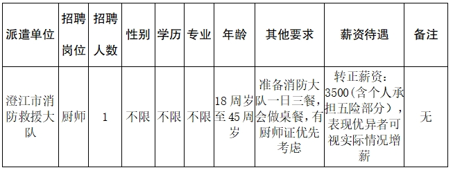 澄江市消防救援大隊因工作需要,委托澄江市啟澄人力資源有限責(zé)任公司,面向社會公開招聘廚師1名,現(xiàn)將有關(guān)事項公告如下: