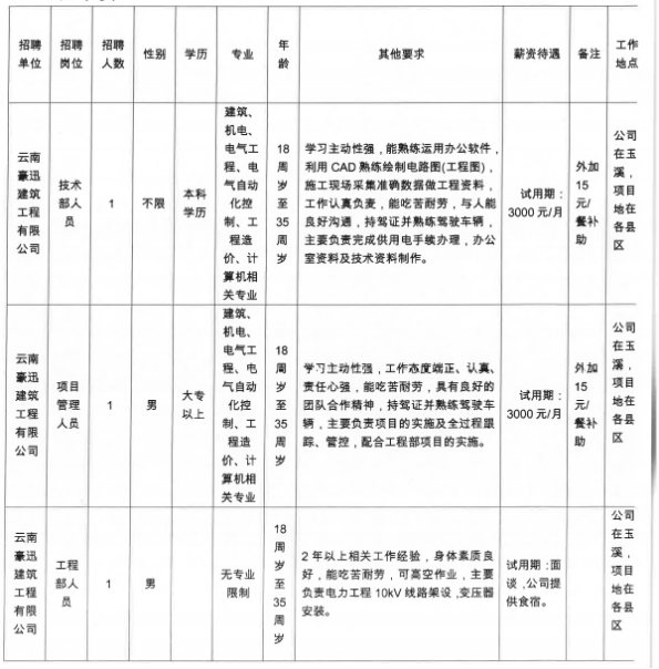 云南豪迅建筑工程有限公司因工作需要,委托澄江市啟澄人力資源有限責(zé)任公司,面向社會公開招聘技術(shù)工作人員3名,現(xiàn)將有關(guān)事項(xiàng)公告如下:
