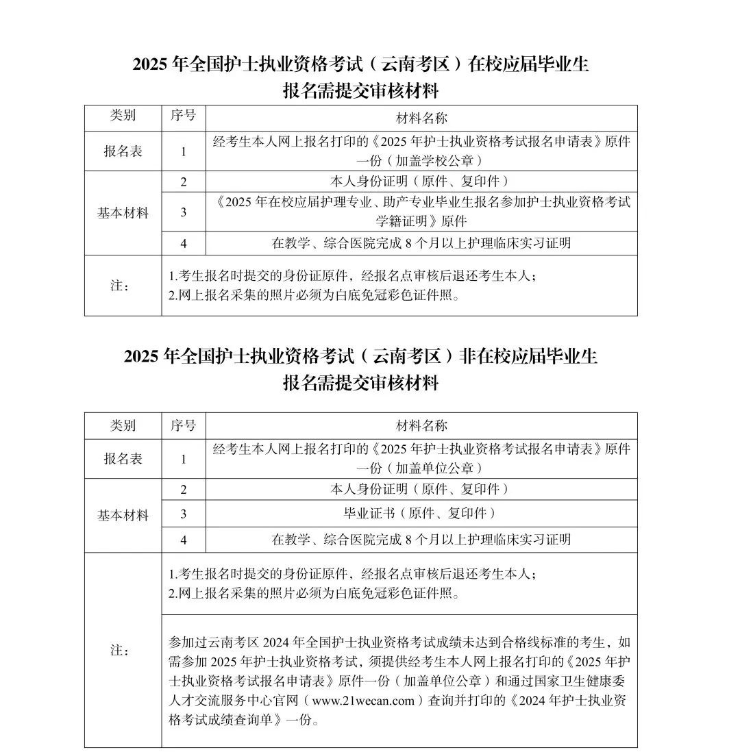 申請人為在校應屆(2025 屆)畢業(yè)生的,應當持有所在學校出具的應屆畢業(yè)生學籍證明;申請人為非應屆畢業(yè)生的,可以選擇到人事檔案所在地報名。考生可登錄云南衛(wèi)生健康人才網( www.ynwsjkrc.cn)查詢2025 年全國護士執(zhí)業(yè)資格考試(云南考區(qū))報名需提交材料目錄。