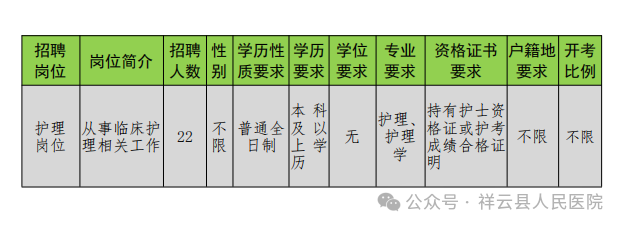 因工作需要,祥云縣人民醫(yī)院面向社會公開招聘護理崗位人員,現(xiàn)將有關事項通告如下:
