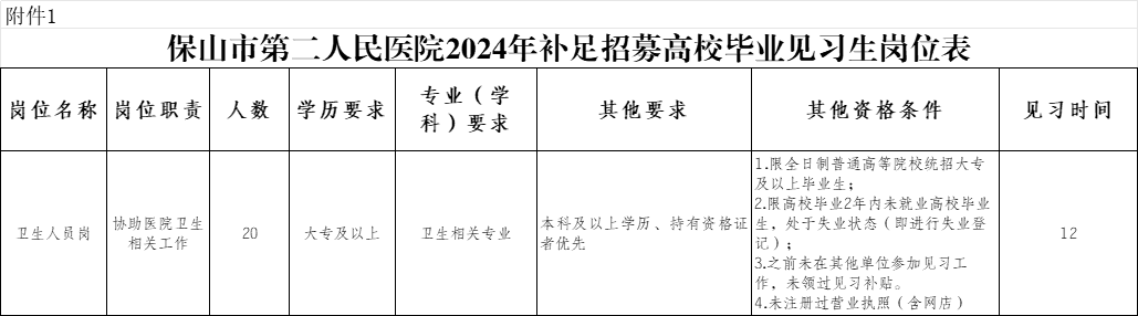 附件1 保山市第二人民醫(yī)院2024年度補(bǔ)足招募高校畢業(yè)見(jiàn)習(xí)生公開(kāi)招募崗位表