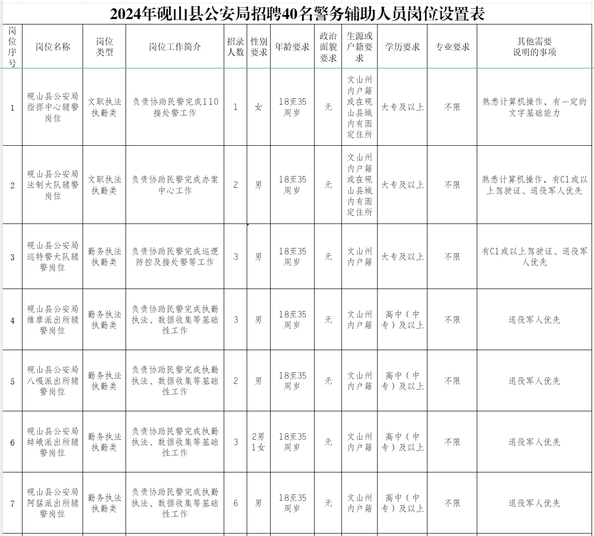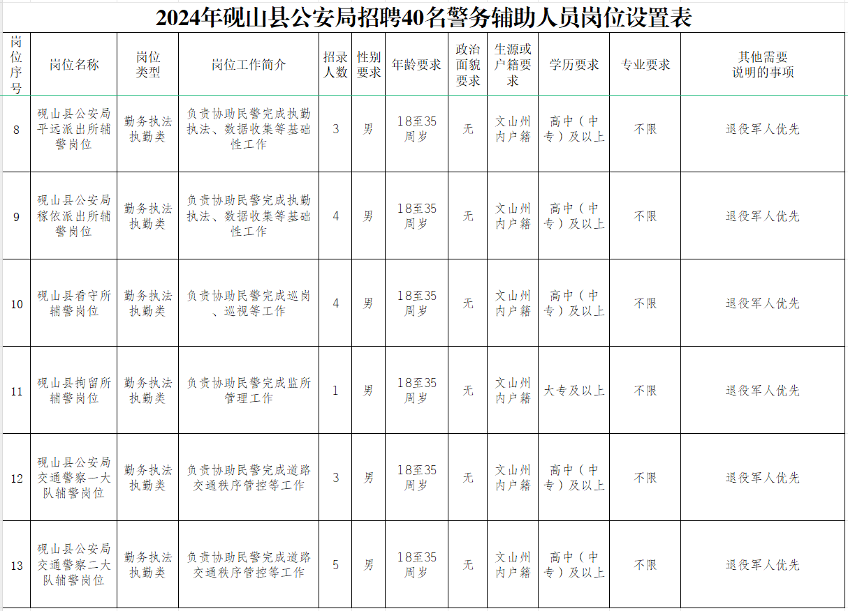 (1)關(guān)注微信公眾號(hào)“硯山警方”查看《2024年文山州公安局警務(wù)輔助人員招聘公告》及《崗位設(shè)置表》。