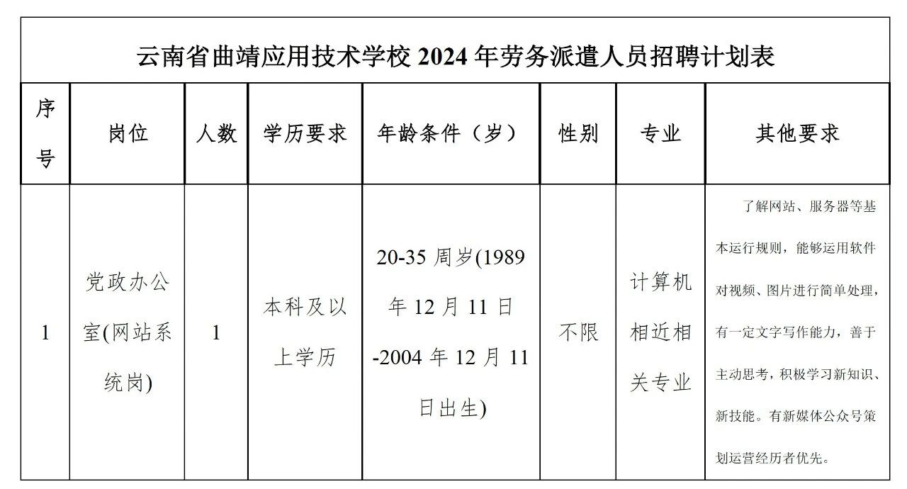 云南驥聘人力資源服務(wù)有限公司受云南省曲靖應(yīng)用技術(shù)學(xué)校委托,面向社會公開招聘勞務(wù)派遣人員1名。公司將按照勞務(wù)派遣的相關(guān)規(guī)定,結(jié)合用人單位工作實(shí)際要求,嚴(yán)格遵循“公開、平等、競爭、擇優(yōu)”的原則,嚴(yán)格考核、擇優(yōu)聘用,現(xiàn)將有關(guān)事項(xiàng)公告如下: