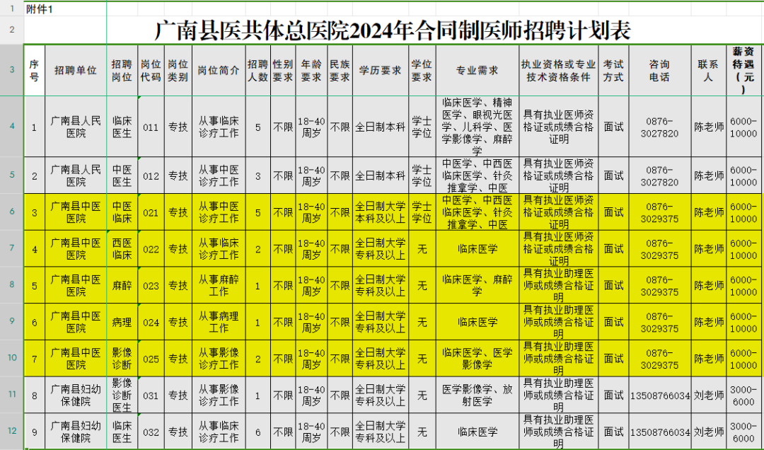 詳見《廣南縣醫(yī)共體總醫(yī)院2024年合同制醫(yī)師招聘計(jì)劃表》(附件1)。