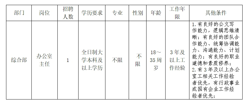 為加強人才隊伍建設,優(yōu)化專技人員結(jié)構,結(jié)合公司工作實際,計劃公開招聘辦公室主任一職,為確保公開招聘工作順利進行,現(xiàn)將有關事項公告如下: