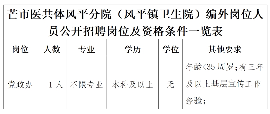 芒市緊密型縣域醫(yī)共體風(fēng)平鎮(zhèn)分院(風(fēng)平鎮(zhèn)衛(wèi)生院)因業(yè)務(wù)發(fā)展需求,現(xiàn)面向社會公開招聘編制外工作人員1名。具體通告如下: