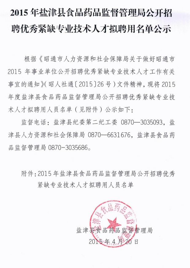 2015年昭通市鹽津縣食藥監(jiān)局公開招聘技術(shù)人才擬聘用名單公示