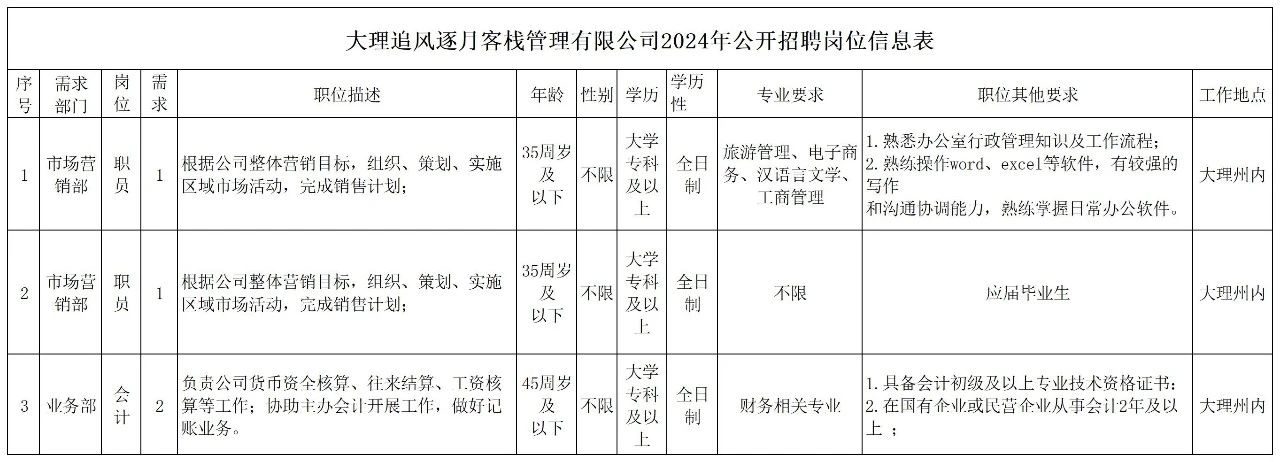 (一)招聘崗位設(shè)置如下:市場(chǎng)營(yíng)銷部職員2名,業(yè)務(wù)部職員2名,具體崗位資格條件詳見(jiàn)附件《大理追風(fēng)逐月客棧管理有限公司2024年公開(kāi)招聘崗位信息表》。