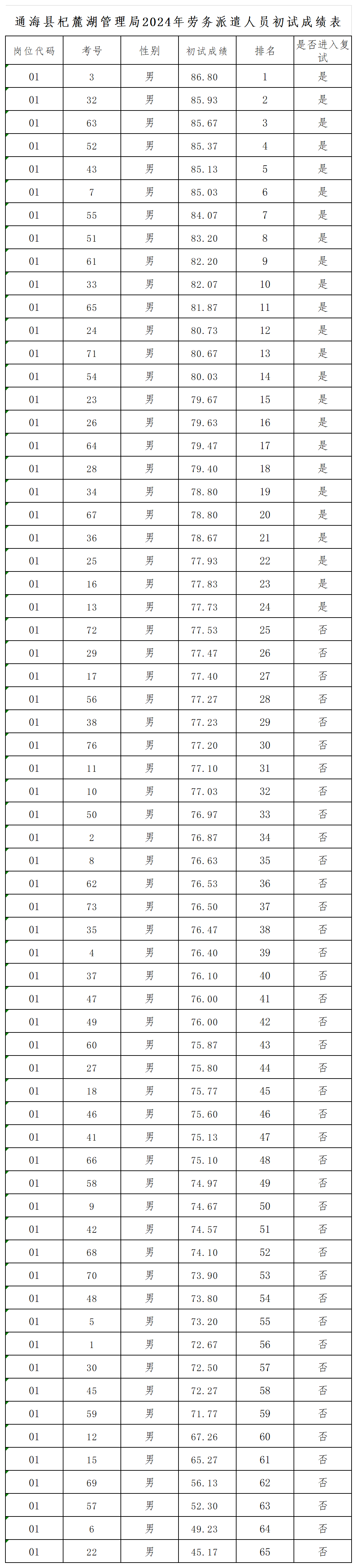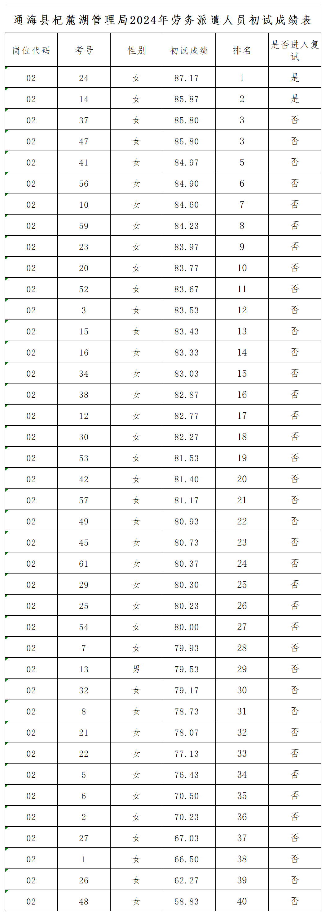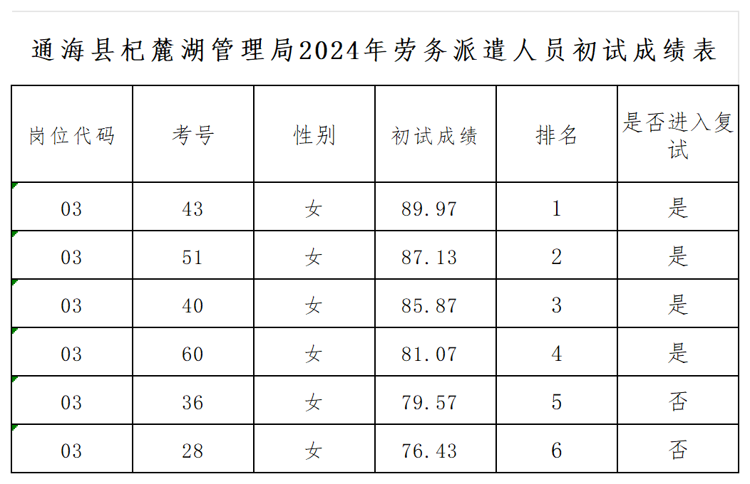 一、通??h杞麓湖管理局2024年勞務(wù)派遣人員招聘初試成績(jī)及進(jìn)入復(fù)試人員名單