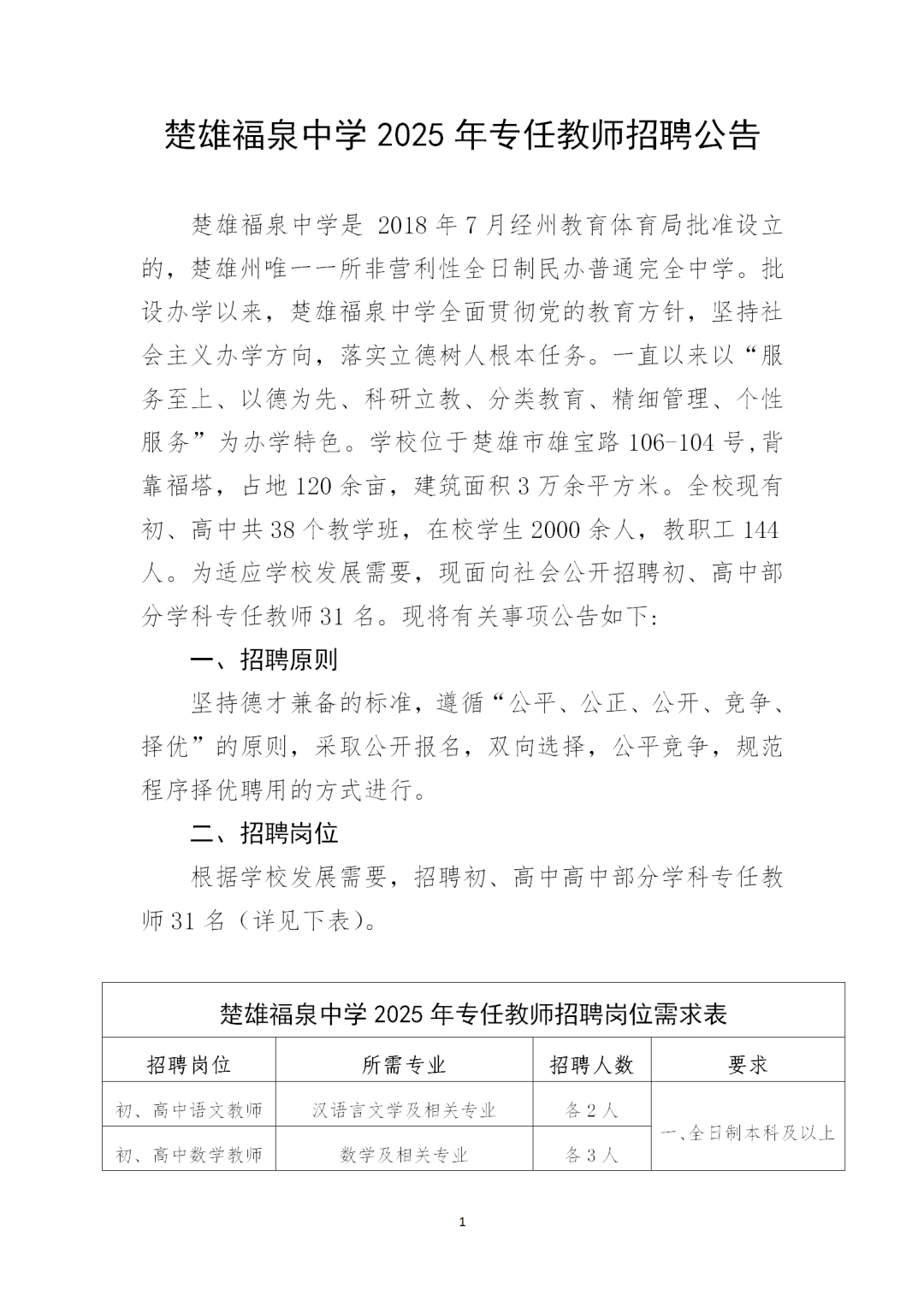 2025年楚雄福泉中學(xué)專任教師招聘公告
