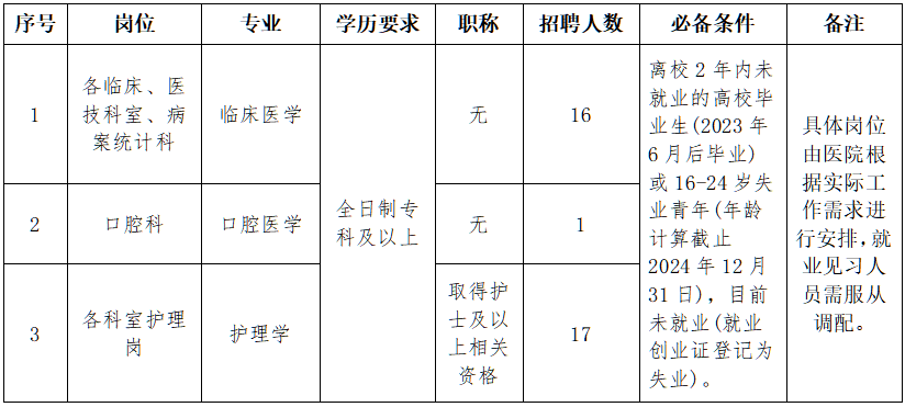 根據《云南省人民政府辦公廳印發(fā)關于進一步推動高校畢業(yè)生等青年就業(yè)創(chuàng)業(yè)17條措施的通知》(云政辦發(fā)〔2023〕26號)精神,結合省、市就業(yè)見習工作相關措施及醫(yī)院業(yè)務發(fā)展需要,經醫(yī)院研究決定,現(xiàn)擬面向社會公開招錄全日制專科及以上學歷臨床醫(yī)學專業(yè)見習崗16名,護理學專業(yè)見習崗17名,口腔醫(yī)學專業(yè)見習崗1名,現(xiàn)將有關事宜公告如下: