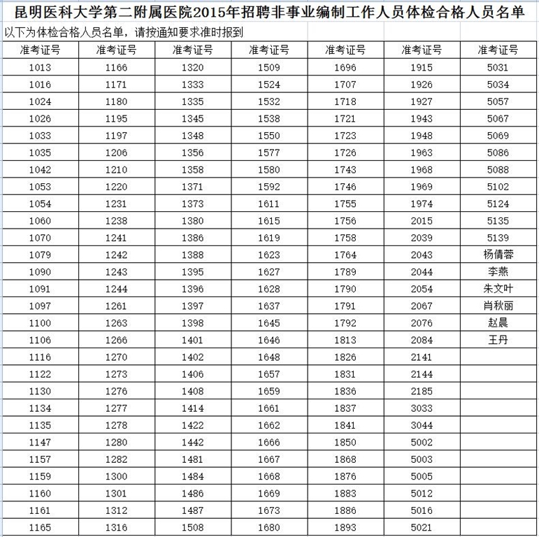 我院2015年招聘非事業(yè)編制工作人員體檢工作已完成,現(xiàn)將體檢合格人員名單進行公布。請體檢合格人員按時報到。報到相關(guān)事宜通知如下: