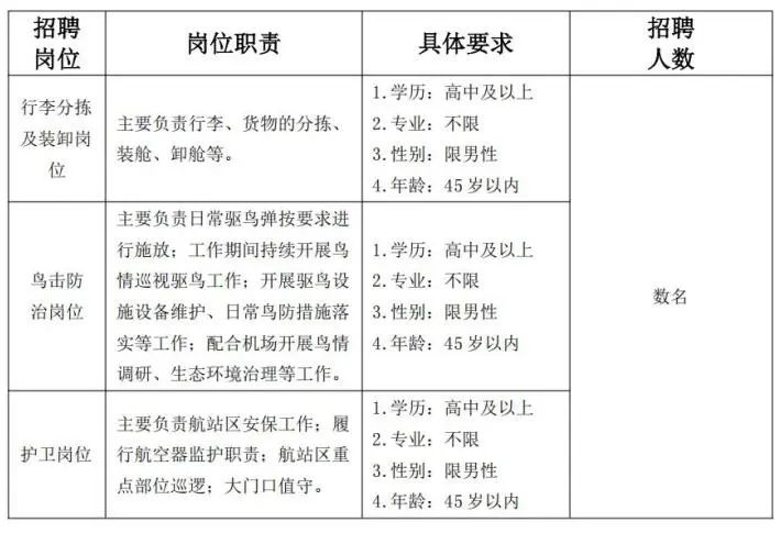 根據工作需要,公司決定面向社會公開招聘迪慶香格里拉機場網點行李分揀及裝卸員、護衛(wèi)員、鳥擊防治員等?,F(xiàn)將招聘內容公告如下:
