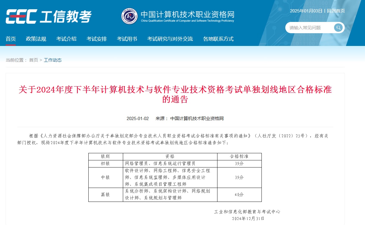 2024年下半年計(jì)算機(jī)技術(shù)與軟件專業(yè)技術(shù)資格考試單獨(dú)劃線地區(qū)合格標(biāo)準(zhǔn)通告