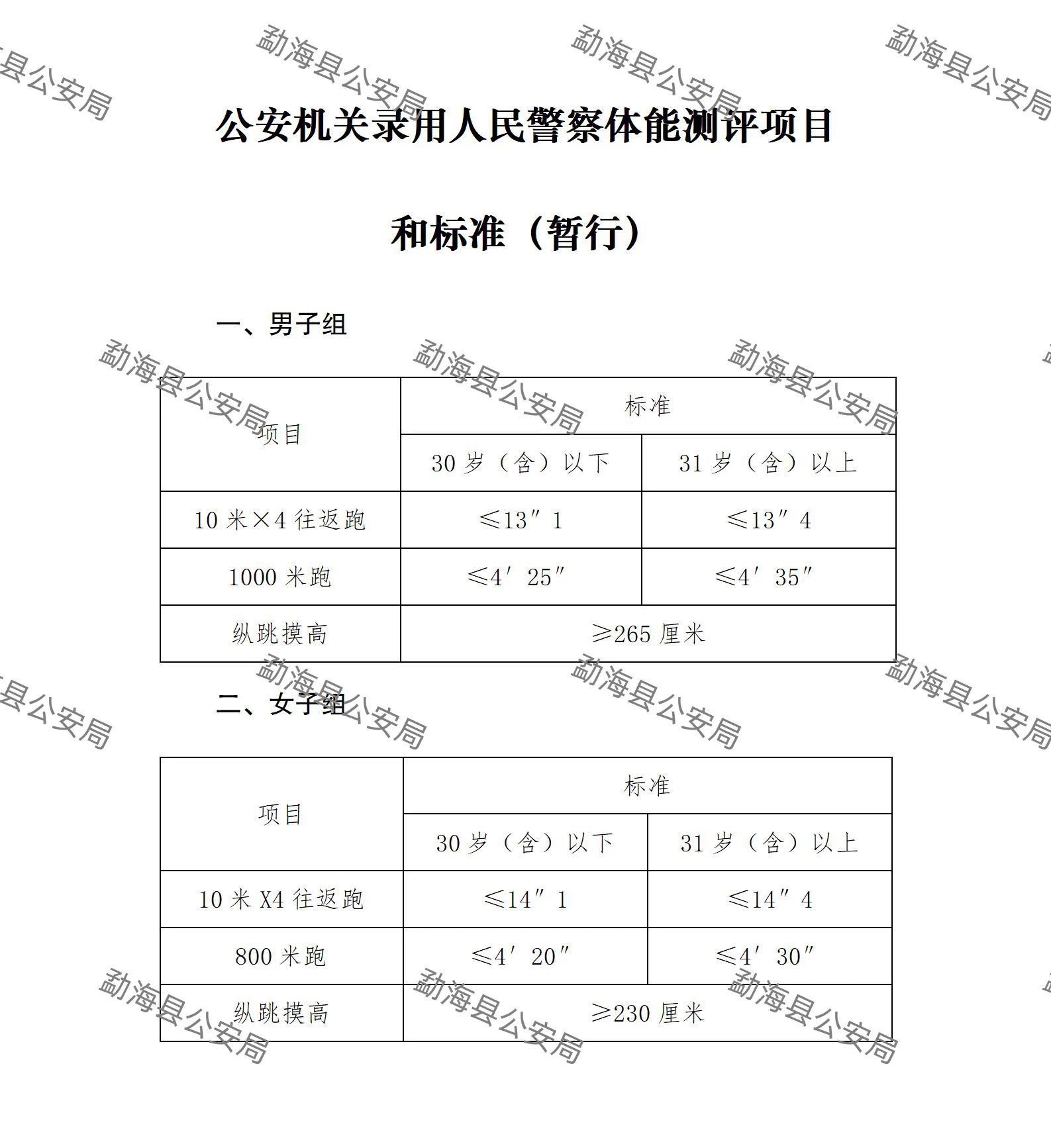測(cè)評(píng)項(xiàng)目:男子:縱跳摸高、10米×4往返跑、1000米;女子:縱跳摸高、10米×4往返跑、800米。體能測(cè)評(píng)原則上參照《公安機(jī)關(guān)錄用人民警察體能測(cè)評(píng)項(xiàng)目和標(biāo)準(zhǔn)(暫行)》(詳情見附件)執(zhí)行,合格者進(jìn)入筆試、面試環(huán)節(jié)。