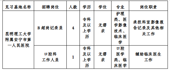 為落實省、市高校畢業(yè)生就業(yè)工作要求,擴大就業(yè)見習規(guī)模,大力開發(fā)高質量就業(yè)見習崗位,現結合醫(yī)院工作實際,立足昆明理工大學附屬安寧市第一人民醫(yī)院的高校畢業(yè)生就業(yè)基地,面向社會招聘就業(yè)見習人員。