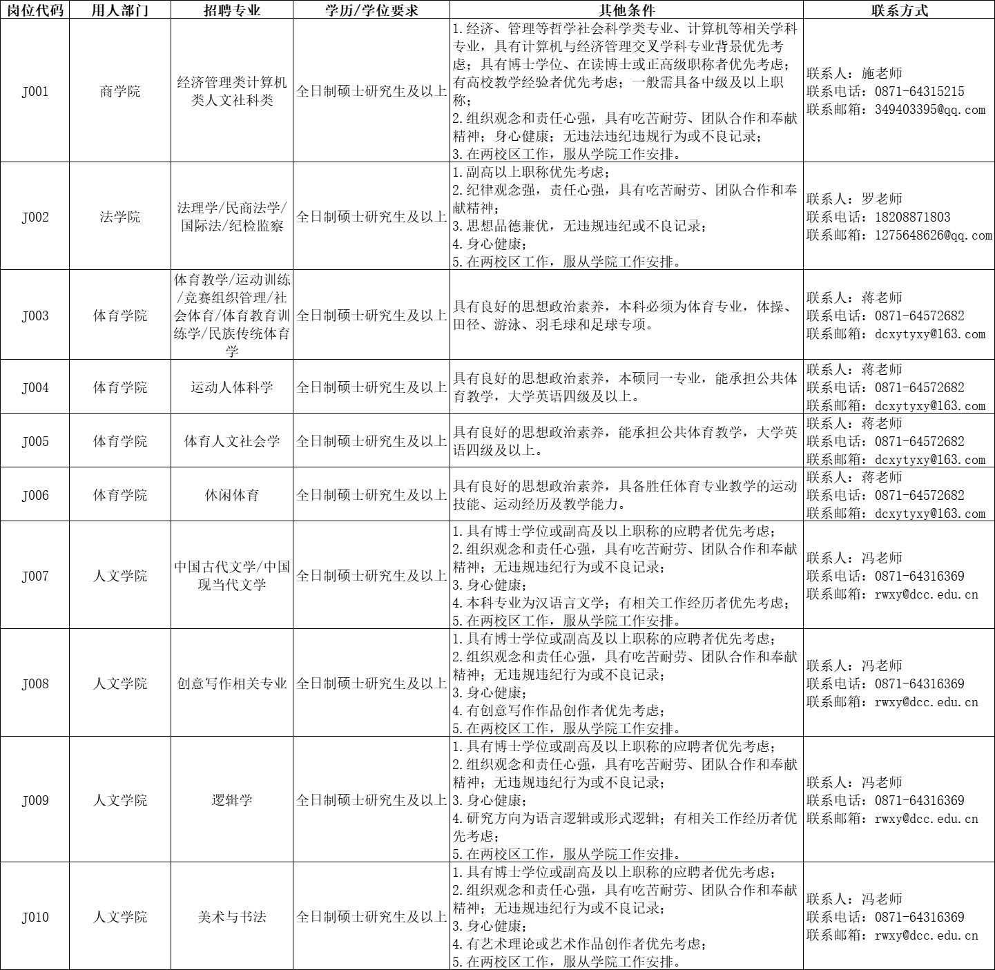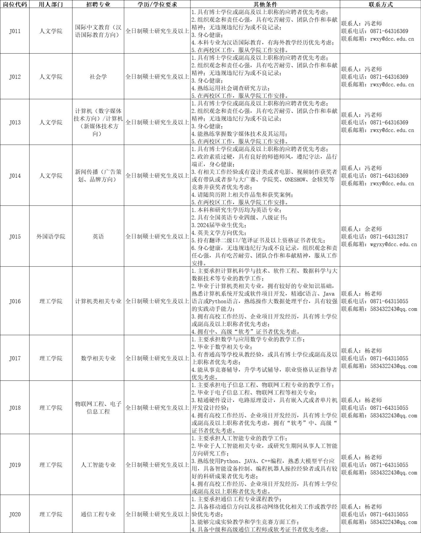 招聘崗位及相關(guān)要求詳見(jiàn)《滇池學(xué)院專職教師招聘計(jì)劃表》,具體招聘人數(shù)請(qǐng)咨詢相關(guān)用人教學(xué)單位。