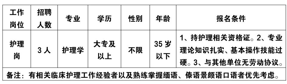 備注:有相關(guān)臨床護(hù)理工作經(jīng)驗(yàn)者以及熟練掌握緬語、傣語、景頗語口語者優(yōu)先考慮。