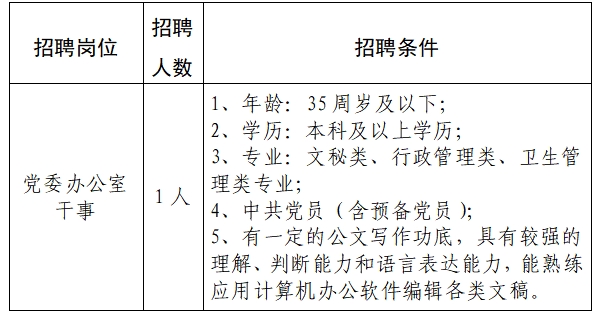根據(jù)醫(yī)院業(yè)務(wù)發(fā)展需求,現(xiàn)黨委辦公室需招聘干事1名,具體招聘條件如下: