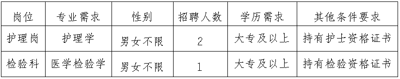 為滿足業(yè)務(wù)工作的需要,擬面向社會(huì)公開招聘2名編外護(hù)理人員、1名醫(yī)學(xué)檢驗(yàn)專業(yè)人員,現(xiàn)將有關(guān)招聘事宜公告如下: