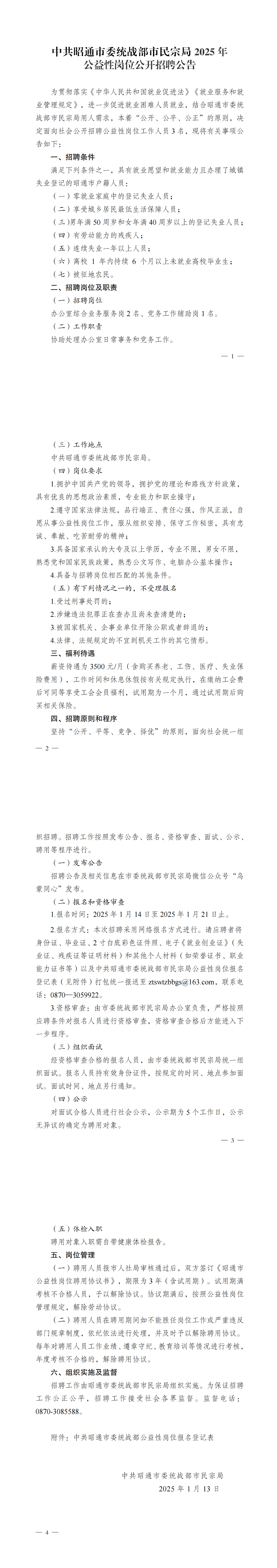 中共昭通市委統(tǒng)戰(zhàn)部市民宗局2025年公益性崗位公開招聘公告