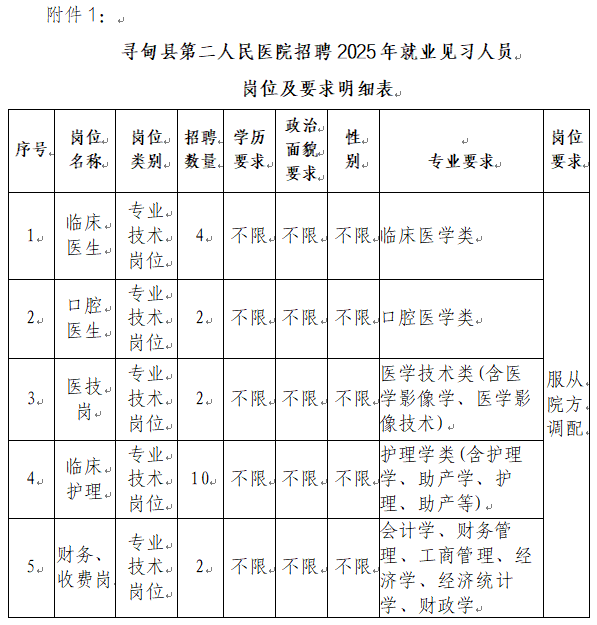 具體崗位要求詳見附件1《尋甸縣第二人民醫(yī)院2025年公開招聘就業(yè)見習(xí)人員計(jì)劃明細(xì)表》