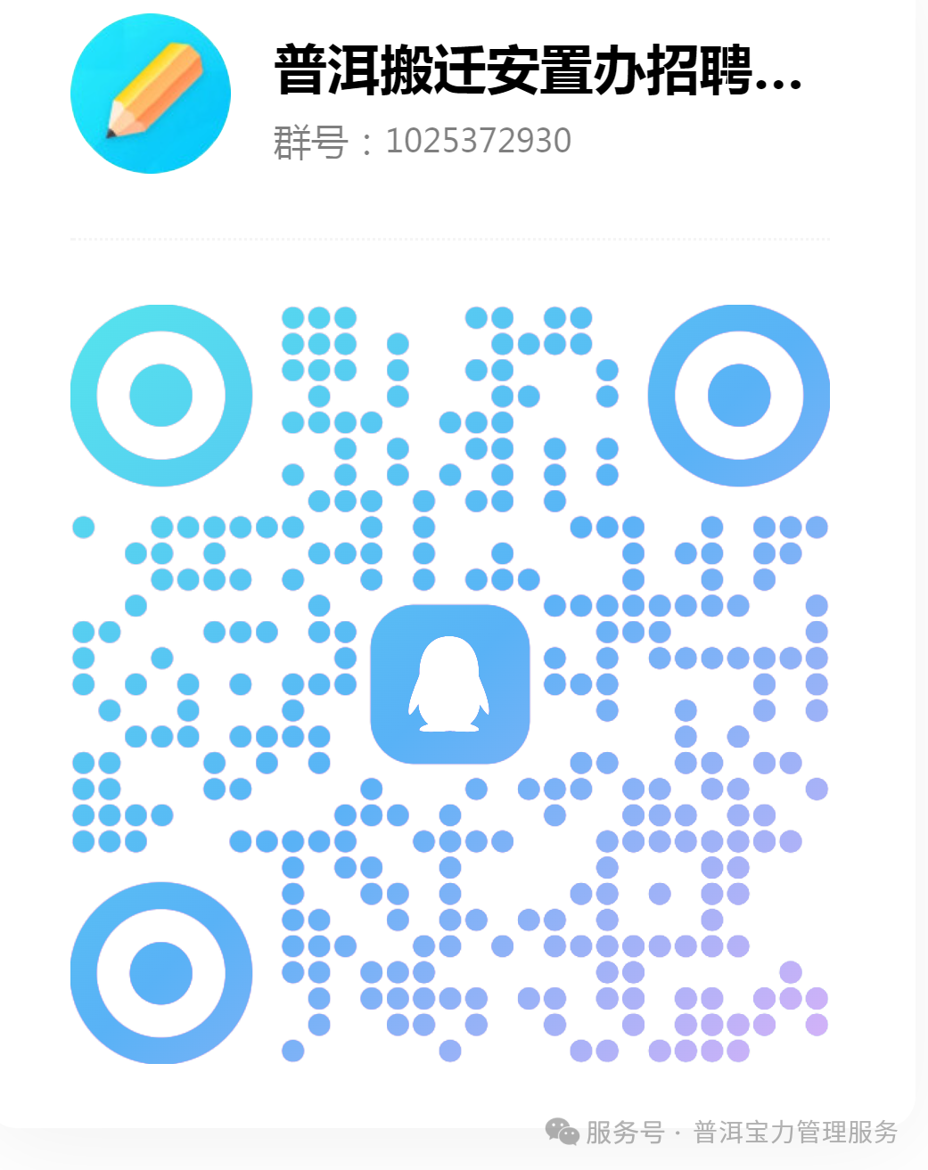 (三)招聘工作期間,報考人員應(yīng)及時關(guān)注招聘工作信息(微信公眾號“普洱寶力管理服務(wù)”,二維碼附后),并掃碼加入本次招聘考試QQ群(二維碼附后);保持聯(lián)系電話暢通,因通訊不暢或未及時關(guān)注招聘工作信息等原因?qū)е孪嚓P(guān)后果由報考人員本人承擔(dān)。