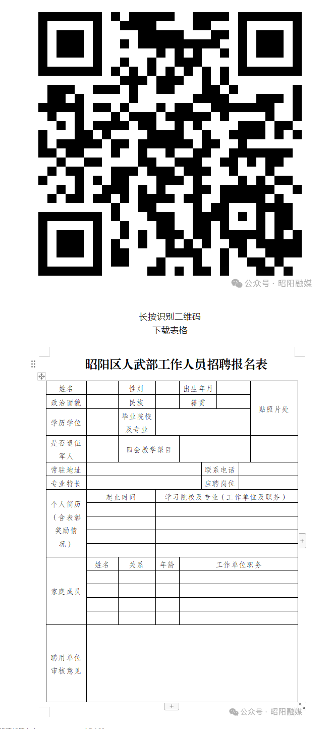 5.《昭陽(yáng)區(qū)人武部工作人員招聘報(bào)名表》(見(jiàn)附件);