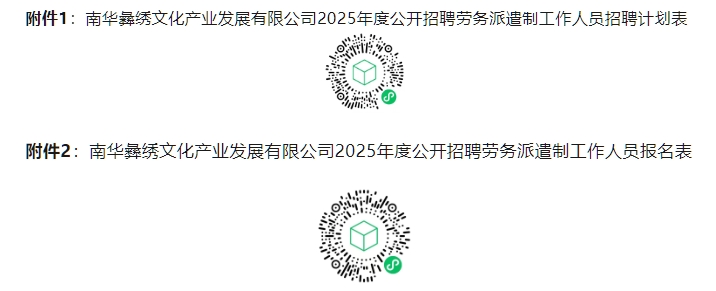 南華彝繡文化產(chǎn)業(yè)發(fā)展有限公司2025年度計劃招聘勞務(wù)派遣員工3名,具體招聘崗位及招聘條件要求詳見附件1(南華彝繡文化產(chǎn)業(yè)發(fā)展有限公司2025年度公開招聘勞務(wù)派遣制工作人員招聘計劃表)。