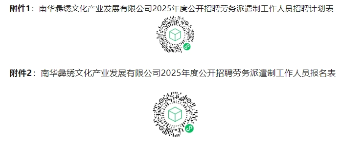 南華彝繡文化產(chǎn)業(yè)發(fā)展有限公司2025年度計劃招聘勞務(wù)派遣員工3名,具體招聘崗位及招聘條件要求詳見附件1(南華彝繡文化產(chǎn)業(yè)發(fā)展有限公司2025年度公開招聘勞務(wù)派遣制工作人員招聘計劃表)。