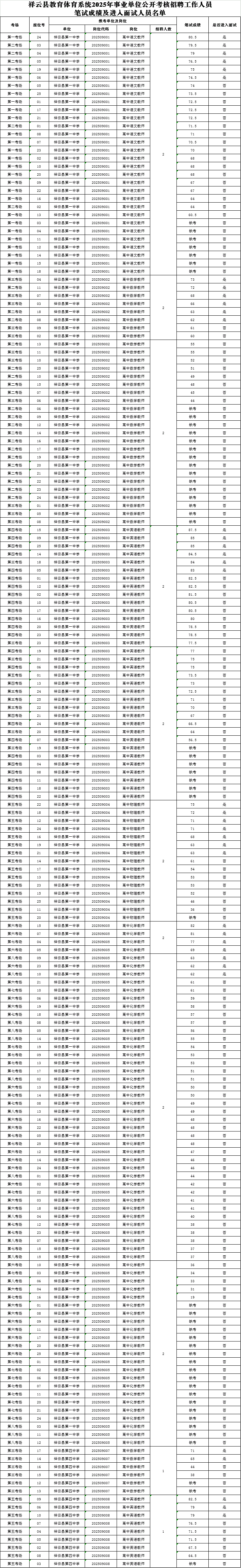 根據(jù)《大理州2025年事業(yè)單位公開考核招聘工作人員公告》,祥云縣教育體育系統(tǒng)2025年事業(yè)單位公開考核招聘祥云縣第四中學(xué)高中語文教師崗位(202509006)由于報(bào)名人數(shù)與招聘人數(shù)等于3:1,報(bào)名資格審查通過的3人直接進(jìn)入面試;其余7個(gè)招聘崗位筆試于2025年1月22日順利完成,筆試成績(jī)及進(jìn)入面試人員名單詳見附件