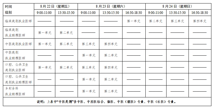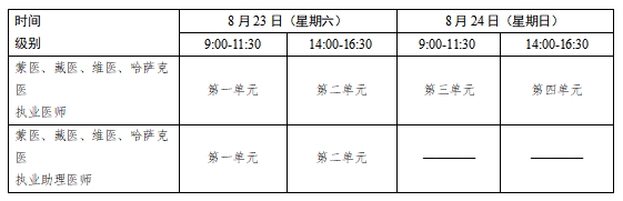 考試實行計算機(jī)化考試,軍隊現(xiàn)役人員加試軍事醫(yī)學(xué)、院前急救崗位和兒科專業(yè)加試相應(yīng)內(nèi)容。中醫(yī)類別蒙醫(yī)、藏醫(yī)、維醫(yī)、哈薩克醫(yī)專業(yè)實行紙筆考試。統(tǒng)一考試時間如下: