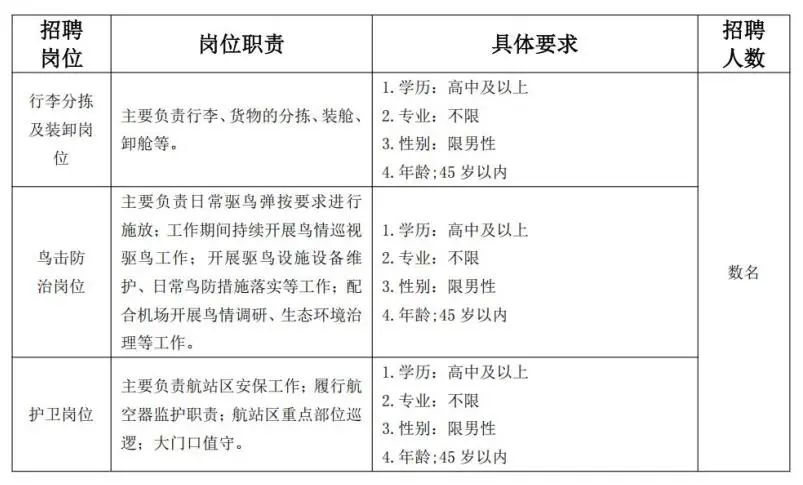 根據(jù)工作需要,公司決定面向社會公開招聘迪慶香格里拉機場網(wǎng)點行李分揀及裝卸員、護衛(wèi)員、鳥擊防治員等。現(xiàn)將招聘內(nèi)容公告如下: