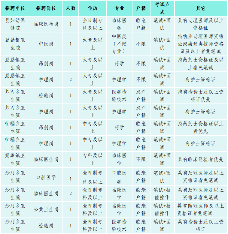 沙河鄉(xiāng)衛(wèi)生院:臨床醫(yī)生考試范圍《診斷學(xué)》,口腔醫(yī)生考試范圍《口腔醫(yī)學(xué)基礎(chǔ)》,檢驗崗考試范圍為醫(yī)學(xué)檢驗技術(shù)相關(guān)專業(yè)知識。