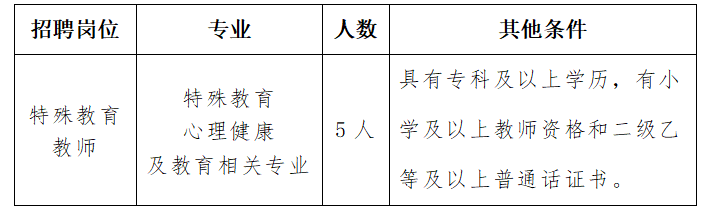 5.有特殊教育專業(yè)背景;有從事小學(xué)相關(guān)學(xué)科教學(xué)、班主任工作經(jīng)歷者優(yōu)先聘用。