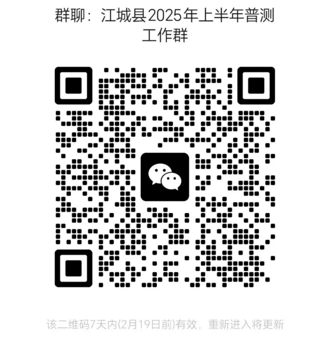 4.線上報名完成后,請及時微信掃碼進入“江城縣2025年上半年普測群”,實時關(guān)注群公告及動態(tài)。