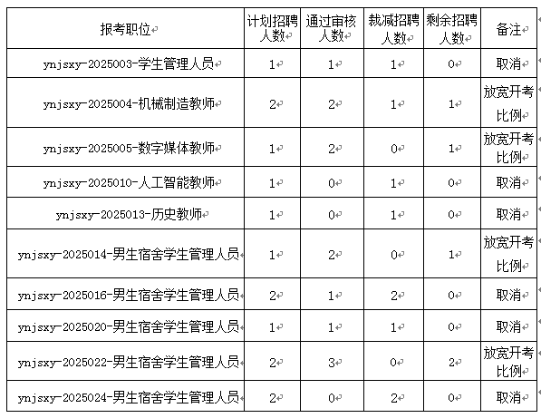 根據(jù)《2025年云南惠民勞務(wù)服務(wù)有限公司勞務(wù)派遣人員公開(kāi)招聘啟示》,按招聘啟示第五部分:報(bào)名程序(六)招聘計(jì)劃裁減“每個(gè)崗位的報(bào)名成功人數(shù)與計(jì)劃招聘人數(shù)不低于3:1方能開(kāi)考。未達(dá)到3:1的,根據(jù)報(bào)名成功人數(shù)予以裁減或取消。招聘急需緊缺專業(yè)崗位,經(jīng)云南技師學(xué)院(云南工貿(mào)職業(yè)技術(shù)學(xué)院)研究同意后可放寬開(kāi)考比例”。經(jīng)云南技師學(xué)院(云南工貿(mào)職業(yè)技術(shù)學(xué)院)研究同意,2025年云南惠民勞務(wù)服務(wù)有限公司勞務(wù)派遣人員公開(kāi)招聘崗位放寬開(kāi)考比例和取消情況如下: