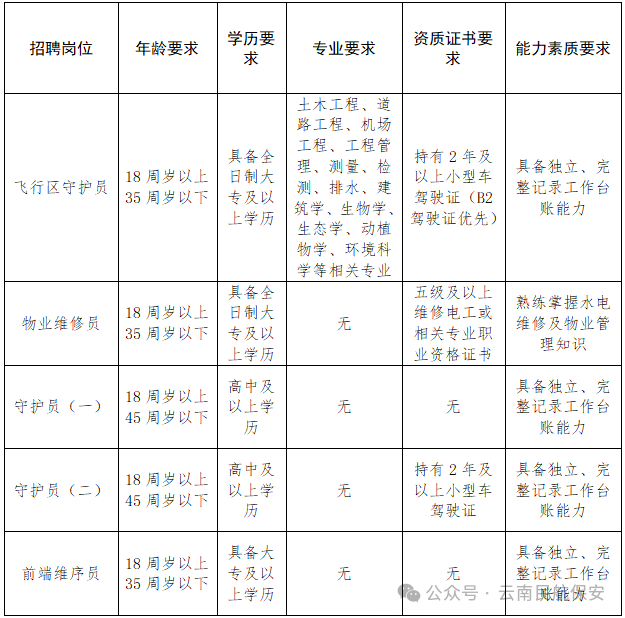 根據(jù)工作需要,公司決定面向社會公開招聘昭通機場飛行區(qū)守護員、物業(yè)維修員、前端維序員等,現(xiàn)將有關事項公告如下: