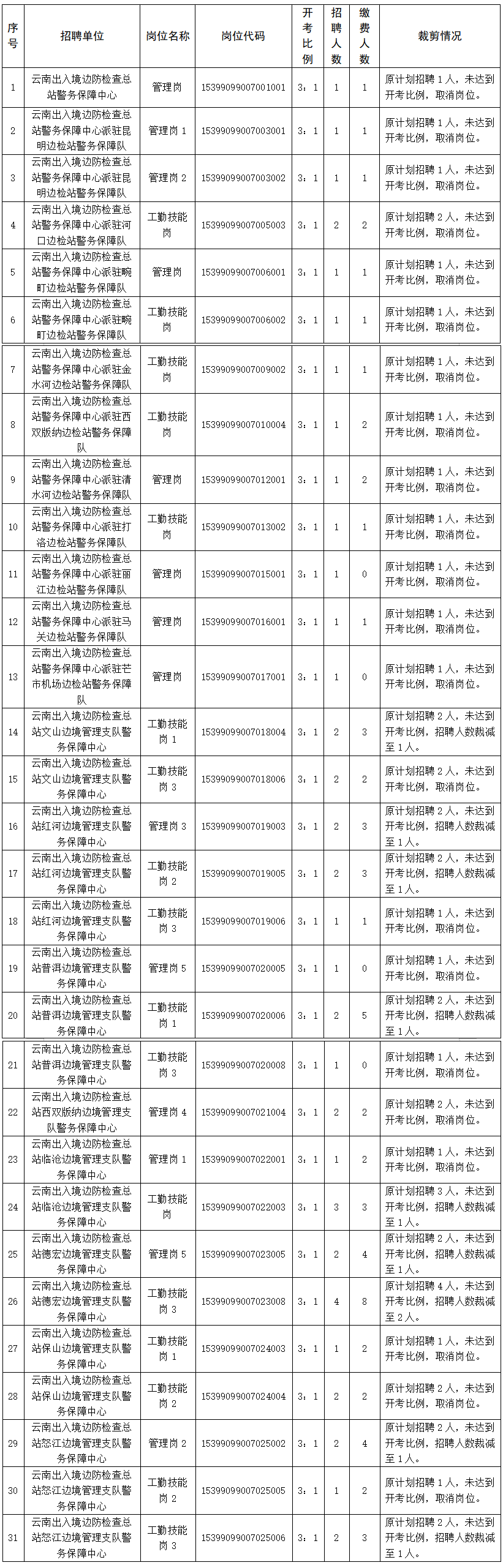 根據(jù)《2025年云南出入境邊防檢查總站所屬事業(yè)單位公開(kāi)招聘人員公告》“每個(gè)崗位的繳費(fèi)人數(shù)與計(jì)劃招聘人數(shù)不低于3:1方能開(kāi)考。未達(dá)到3:1的,根據(jù)繳費(fèi)人數(shù)予以裁減或取消。”的要求,結(jié)合網(wǎng)上報(bào)名、資格審查、繳費(fèi)等情況,現(xiàn)將崗位裁減情況公告如下:
