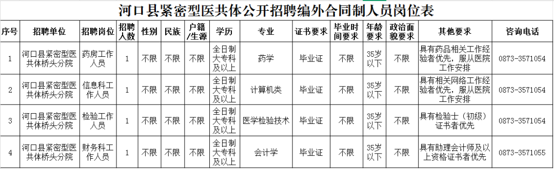 具體詳見《河口縣緊密型醫(yī)共體2025年第二次公開招聘編外合同制人員崗位表》(附件1)