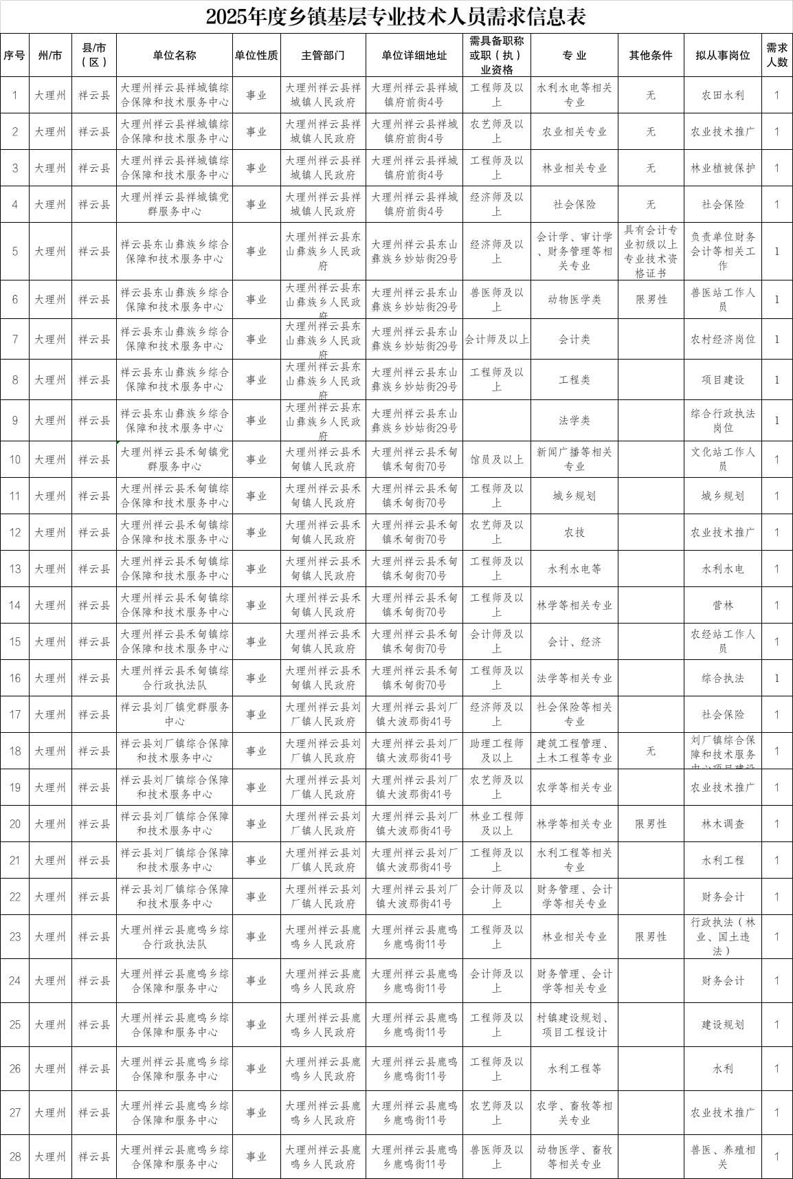 祥云縣2025年鼓勵(lì)專業(yè)技術(shù)人員到鄉(xiāng)鎮(zhèn)基層服務(wù)所需服務(wù)崗位公告