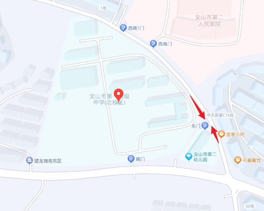(四)文山市第一初級(jí)中學(xué)北校區(qū)。考點(diǎn)地址:文山市臥龍街道登科路8號(hào),乘坐12路公交車可達(dá),地圖鏈接:https://j.map.baidu.com/c5/H-C,位置圖如下: